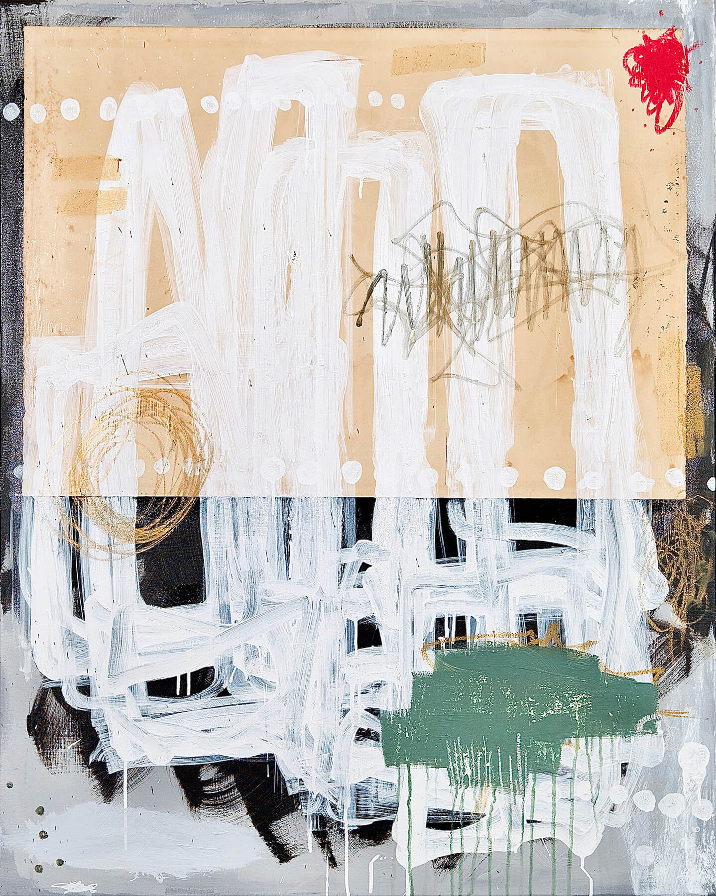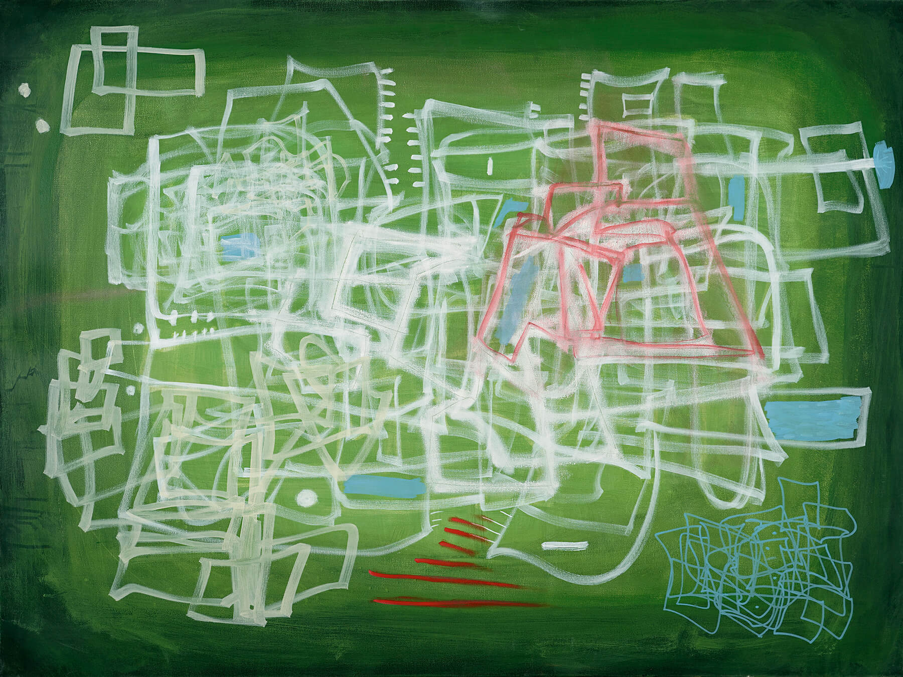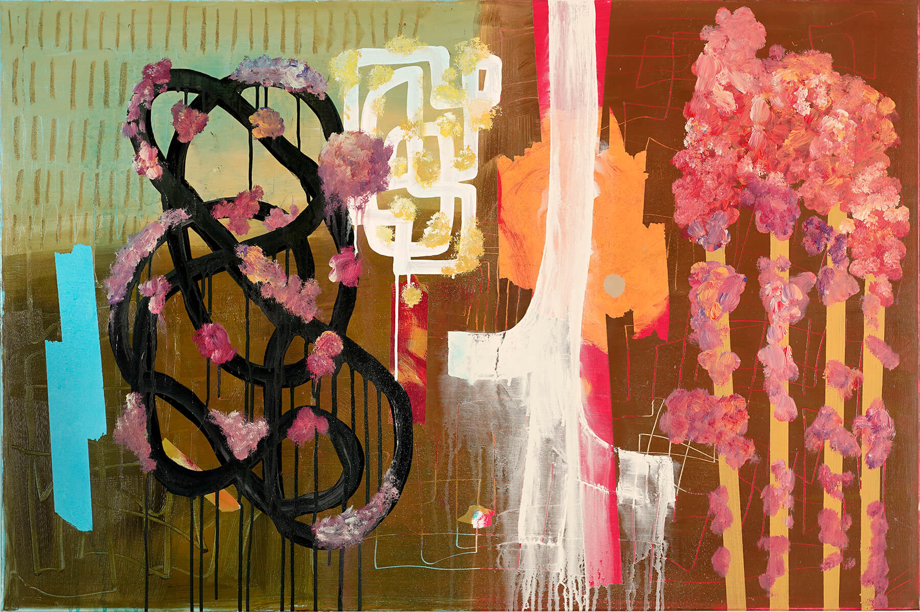 Acrylic, oil bar, graphite, pencil, chalk on canvas