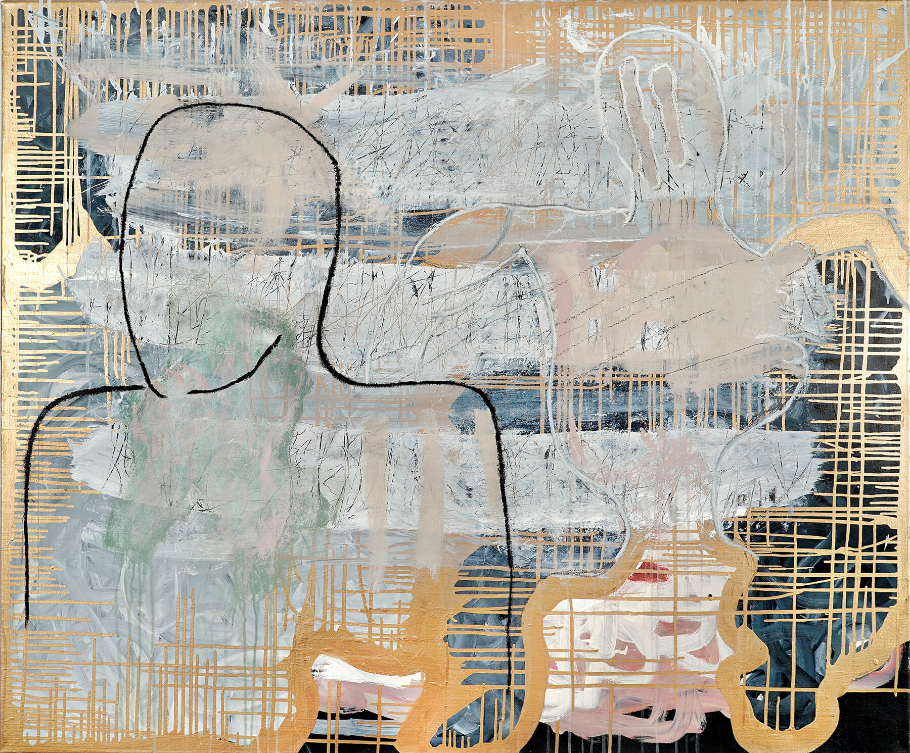 Acrylic, graphite, oilbar, metallic ink on canvas